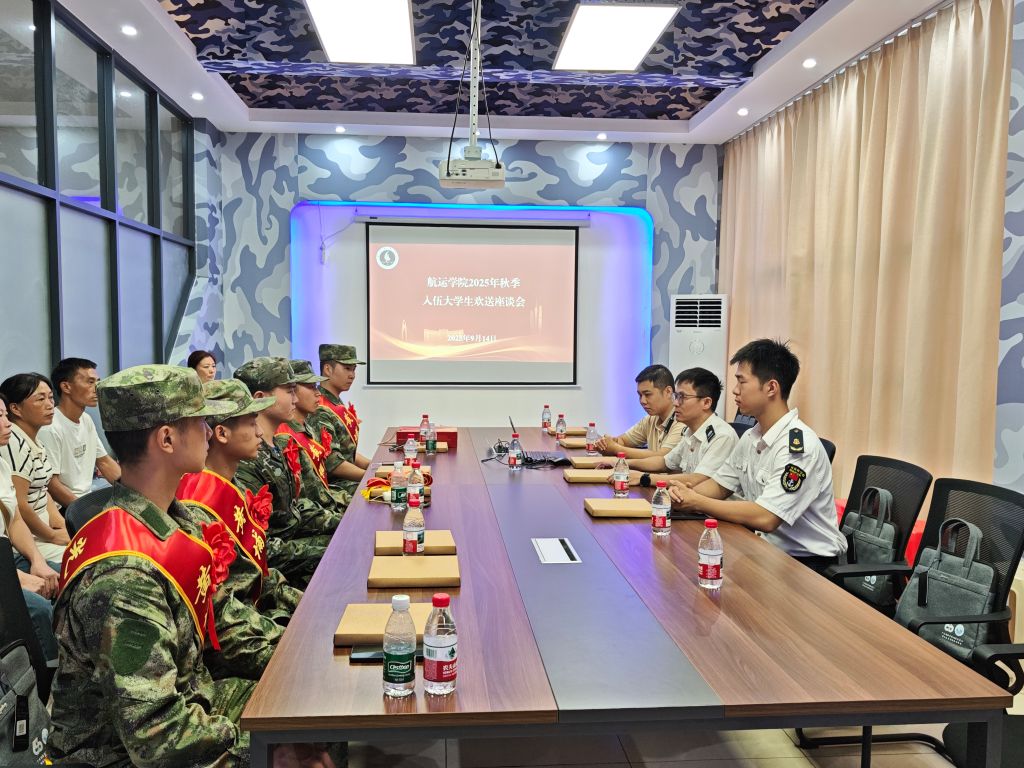9月17日上午,航运学院在黄埔校区B11健兵北军事文化室举行2025年秋季征兵入伍大学生欢送座谈会。学院学生工作负责人钟聪仕、入伍学生及家长、中队长和在校生代表参加了本次座谈会。